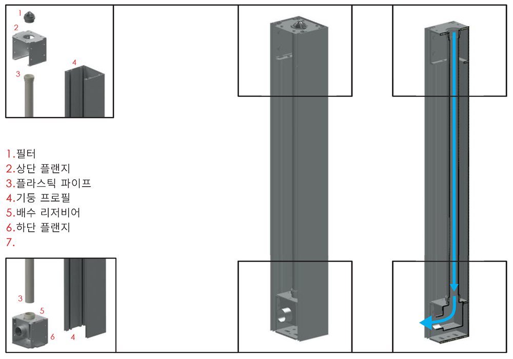 배수경로에 포함 된 물은 마지막 단계에서 시스템의 전면 및 후면 스트럿으로 전달됩니다. 필터를 통과하는 물은 하부 pima 파이프를 포함하여 하부 플랜지에 장착된 저수지로 이송됩니다. 그리고 여기에서 대피합니다. 직경이 50mm인 컬럼 드레인 시스템의 배수 용량은 0.981/s입니다.
