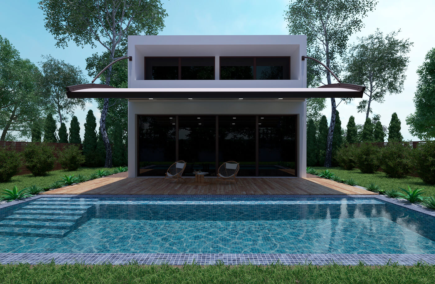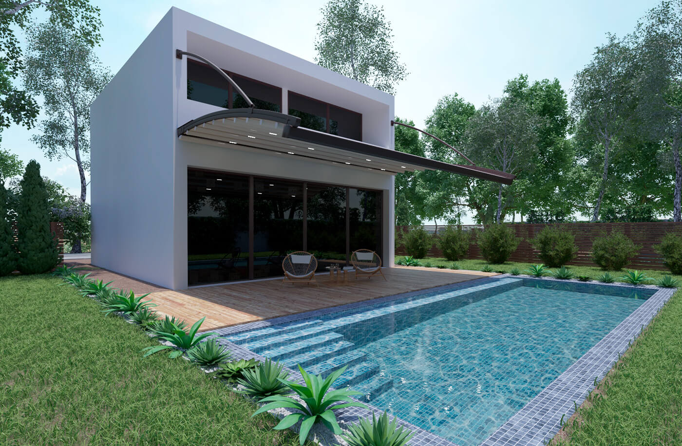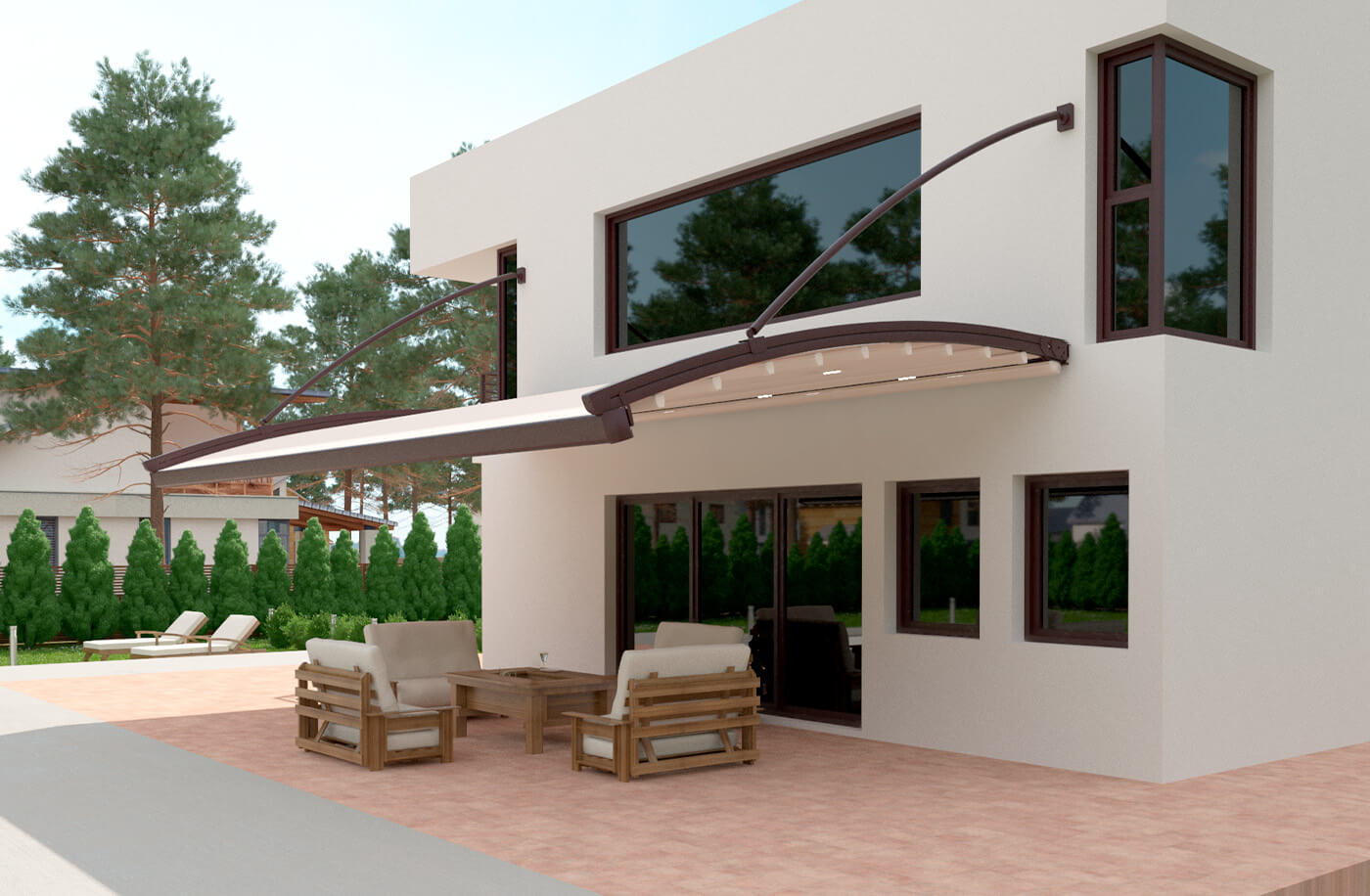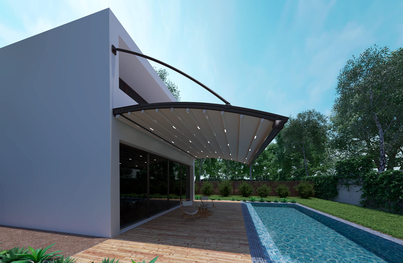 Bosso를 사용하면 전면에 기둥 지지대가 필요 없어 Pergola의 베어러 레일 프로파일에 연결된 특수 강철 헹거 부품을 사용하여 현재 영역의 벽이나 천장에 장착할 수 있습니다.