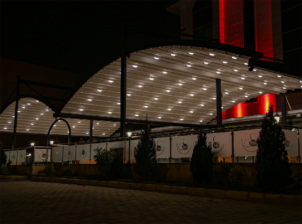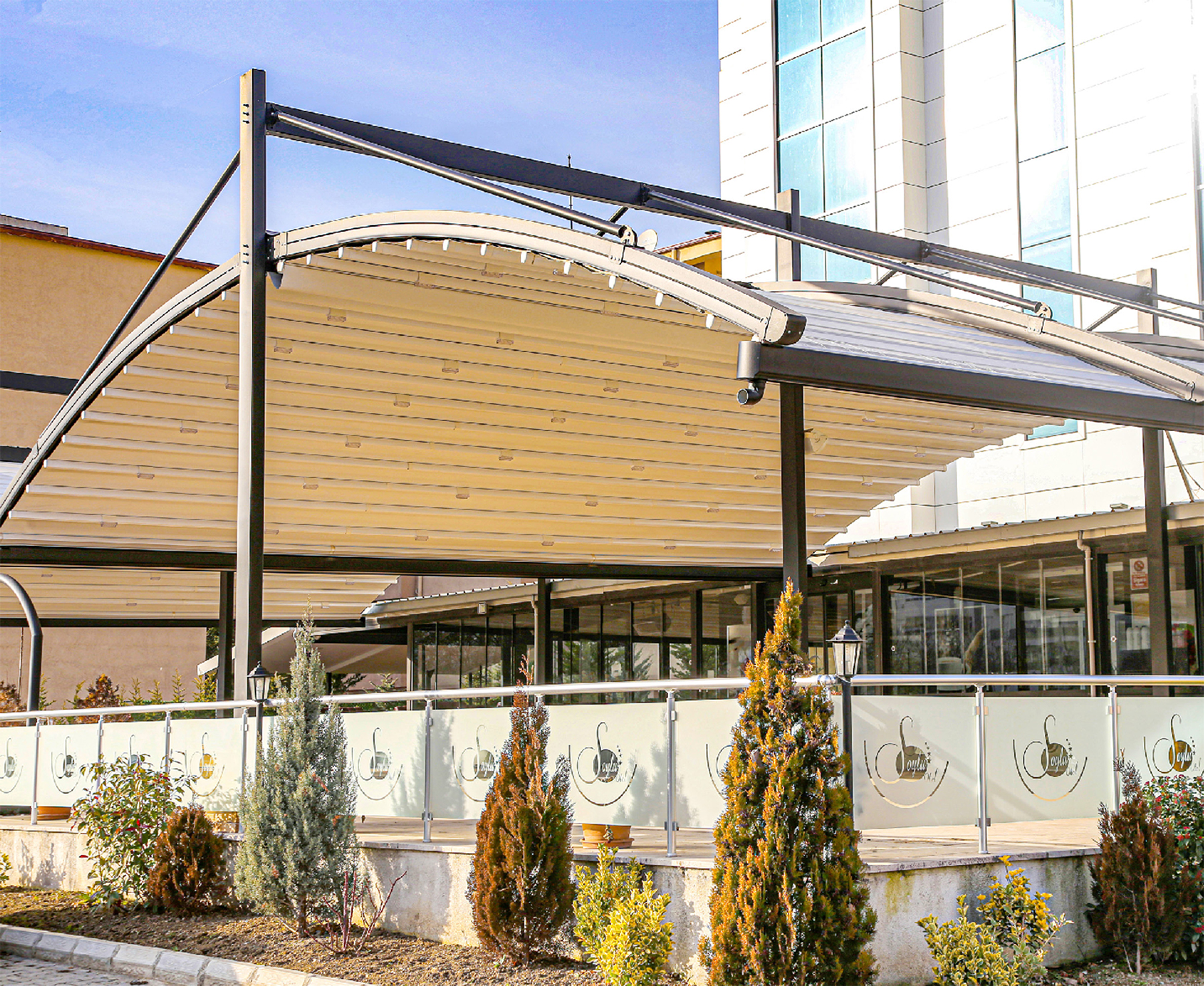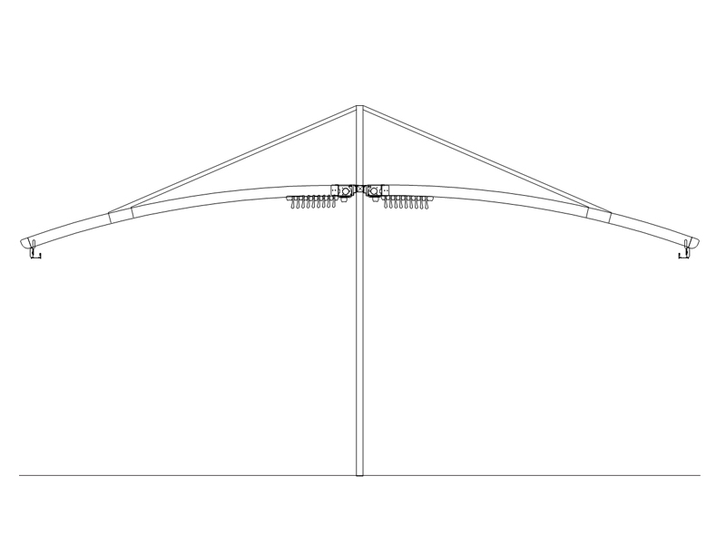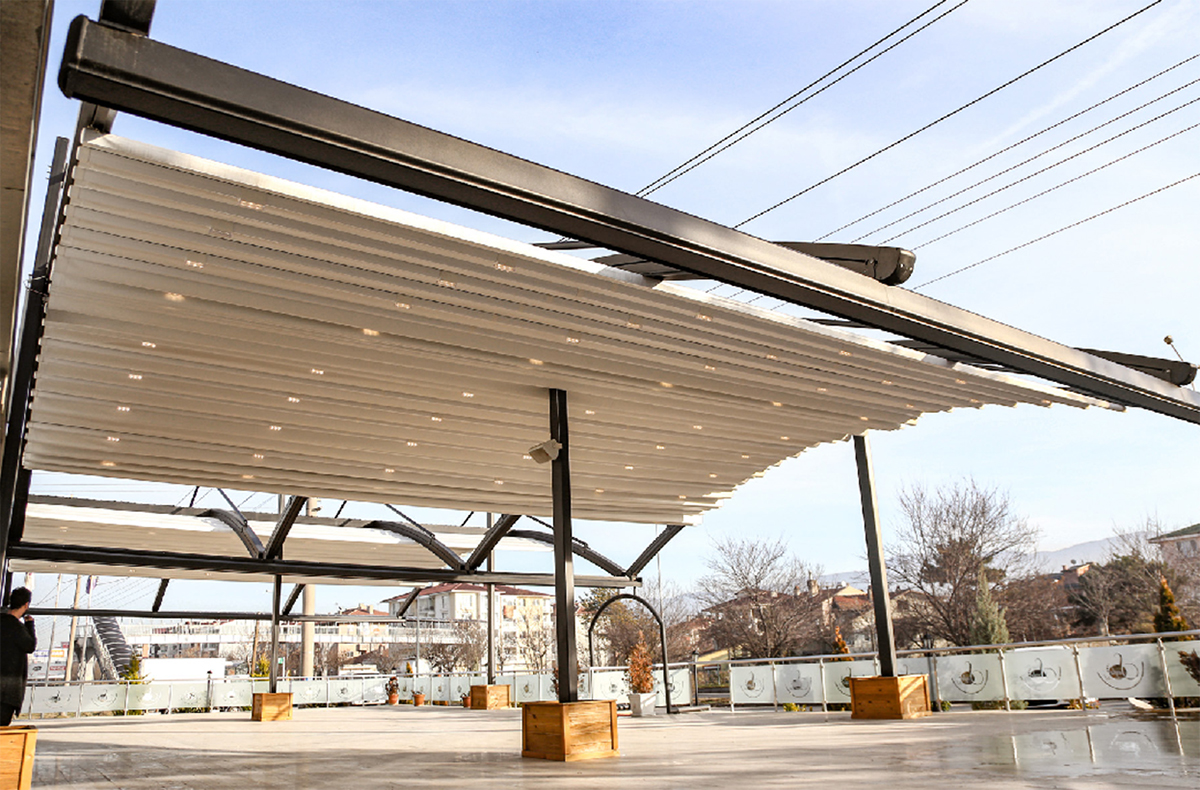 이것은 pergola의 베어링 레일 프로파일 위에 연결된 특수 강철 행거 부품을 사용하여 중앙 백본에 장착됩니다.