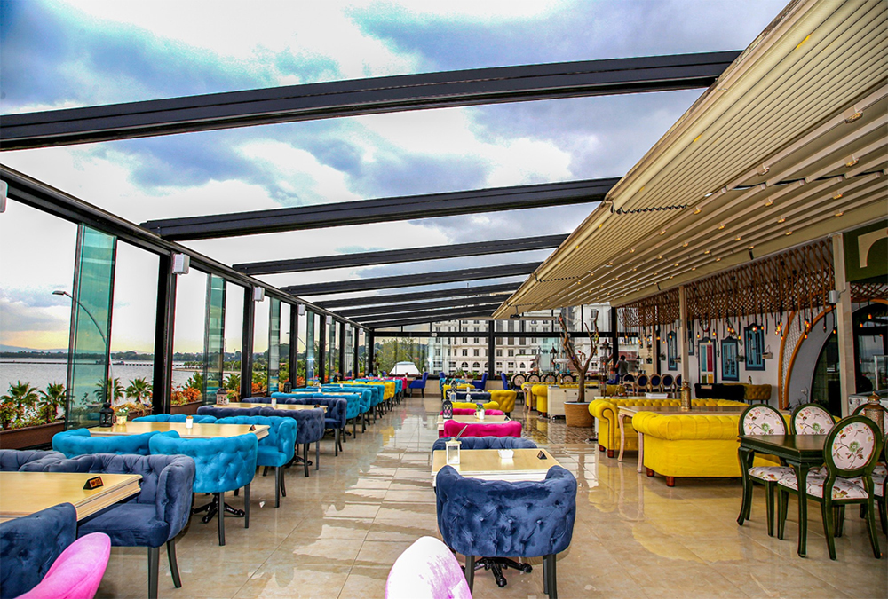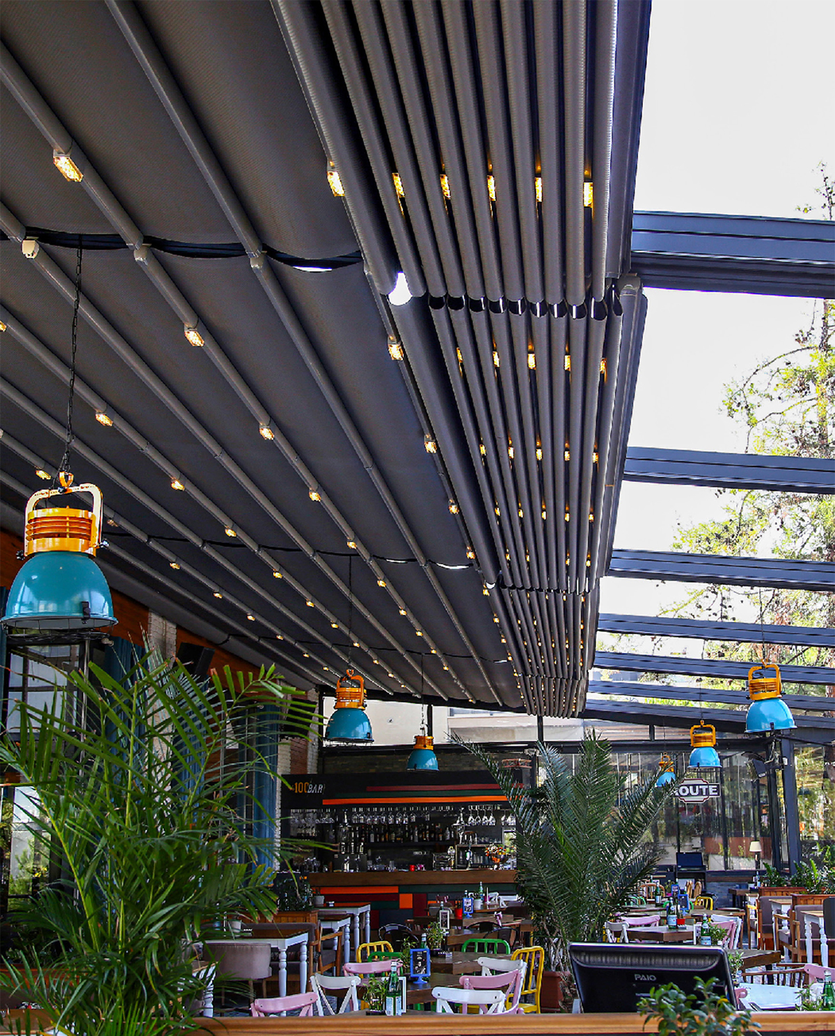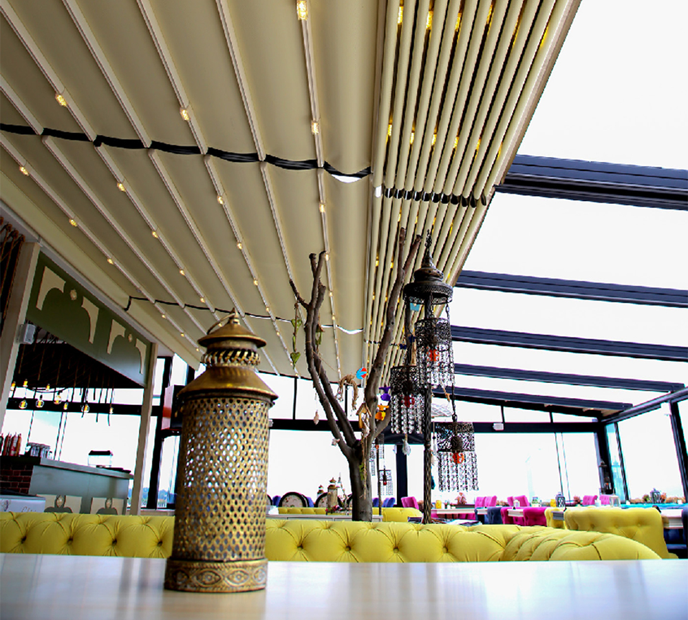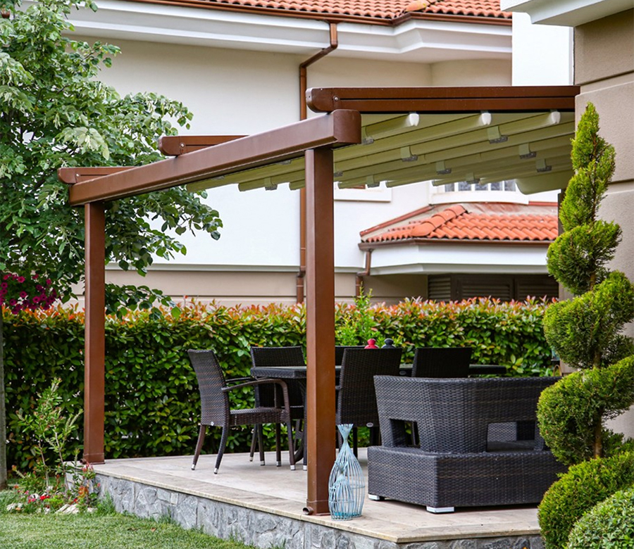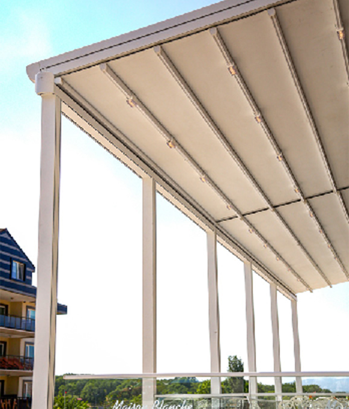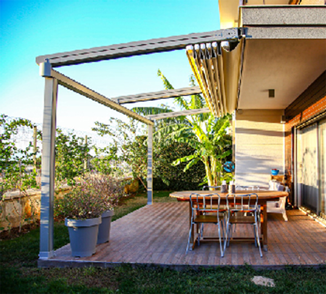 Cedrus는 pergola의 앞부분, 뒤쪽 부분에 위치한 알루미늄 기둥에서 특수 출력 플랜지 플레이트와 강철지지 구조의 도움을받는 동안 "벽" 또는 "천장"과 같은 영역을 장착할 수 있는 기회를 제공합니다.